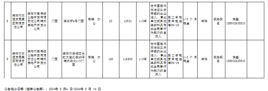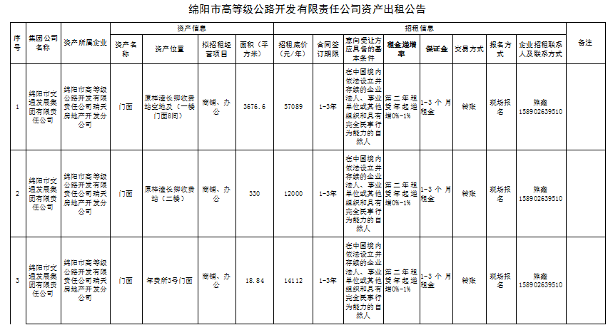 綿陽(yáng)市高等級(jí)公路開(kāi)發(fā)有限責(zé)任公司資產(chǎn)出租公告