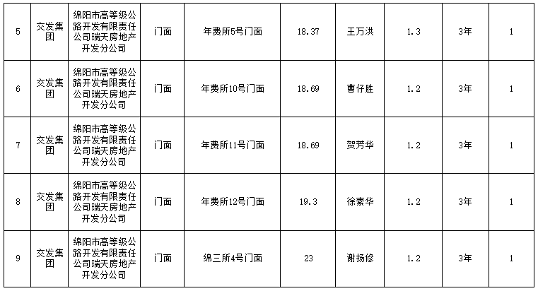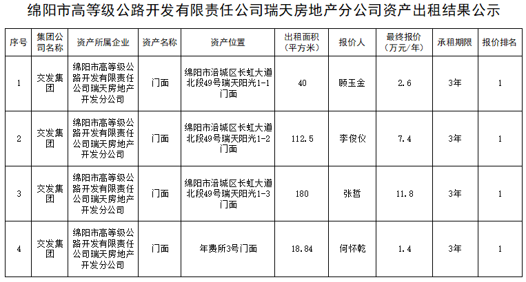 綿陽(yáng)市高等級(jí)公路開(kāi)發(fā)有限責(zé)任公司瑞天房地產(chǎn)分公司資產(chǎn)出租結(jié)果公示
